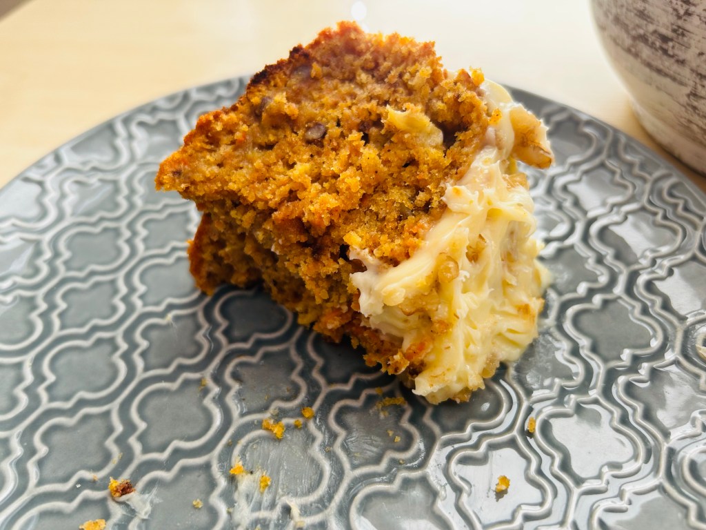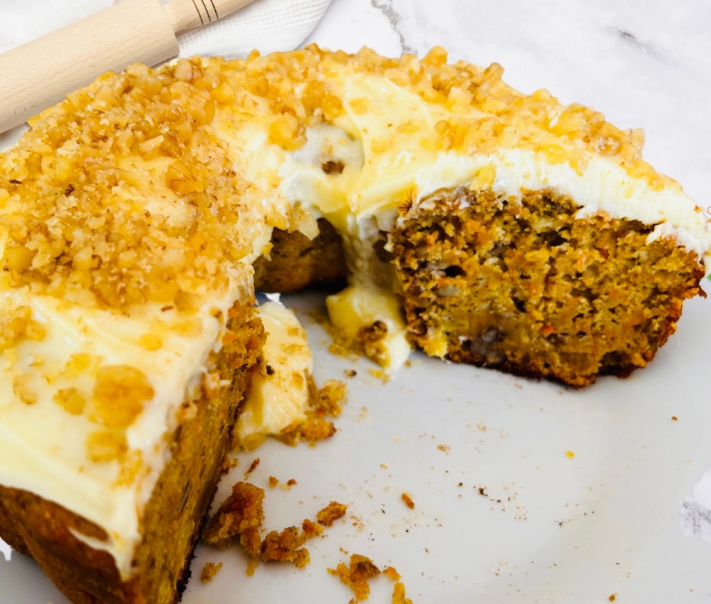 In a bowl, beat eggs until pale, then gradually whisk in the white sugar, oil and vanilla. In a separate bowl combine the flour, baking soda, salt and cinnamon, then combine the dry ingredients with the wet mixture and stir just until combined, don’t over mix. Now add in the carrots and walnuts and fold in until combined. Pour the cake batter evenly into cake tins or Bundt tin.
