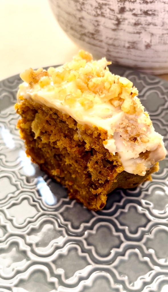 Leave the cream cheese and butter at room temperature. Add both to a bowl along with the lemon juice and vanilla extract and mix together briefly. Now add in the 2 cups of powdered sugar and mix until smooth. You can leave this in the fridge for 20 minutes to stiffen while the cake cools. Once the cake has cooled, frost the cake cake and add chopped walnuts on top of the frosting (optional).